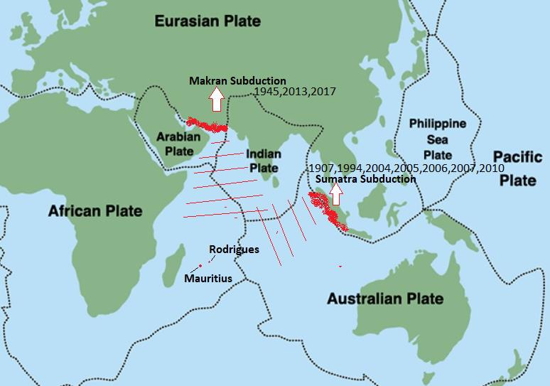 Figure 1: Tectonic plates showing Makran and Sumatra subduction zones and year of major seismic activity [2]