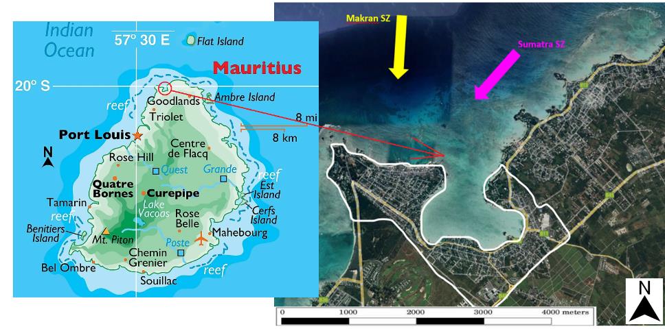 Though Mauritius is located thousands of kilometres from the subduction zones, waves of low amplitudes reached the Mauritian coast from the Tsunami of December 26, 2004 (Sumatra) without any major damage. Rodrigues Island (550km eastward of Mauritius) was more affected with unexpected waves penetrating beyond the usual tides, showing that the risk though, of low probability can be of high magnitude. The degree of risk closely related to the time factor has been taken into consideration by the Tsunami Warning System managed by the Mauritius Meteorological Services (MMS). As per their geographical location, Mauritius and Rodrigues have a lead time of 5 to 7 hours [6] before tsunami waves are likely to reach their coasts from either the Makran [7] or the Sumatra source. However, in the event of the epicentre of the seism being closer to Mauritius, within the divergent tectonic plates, a tsunami strike will be relatively less than 3 hours.