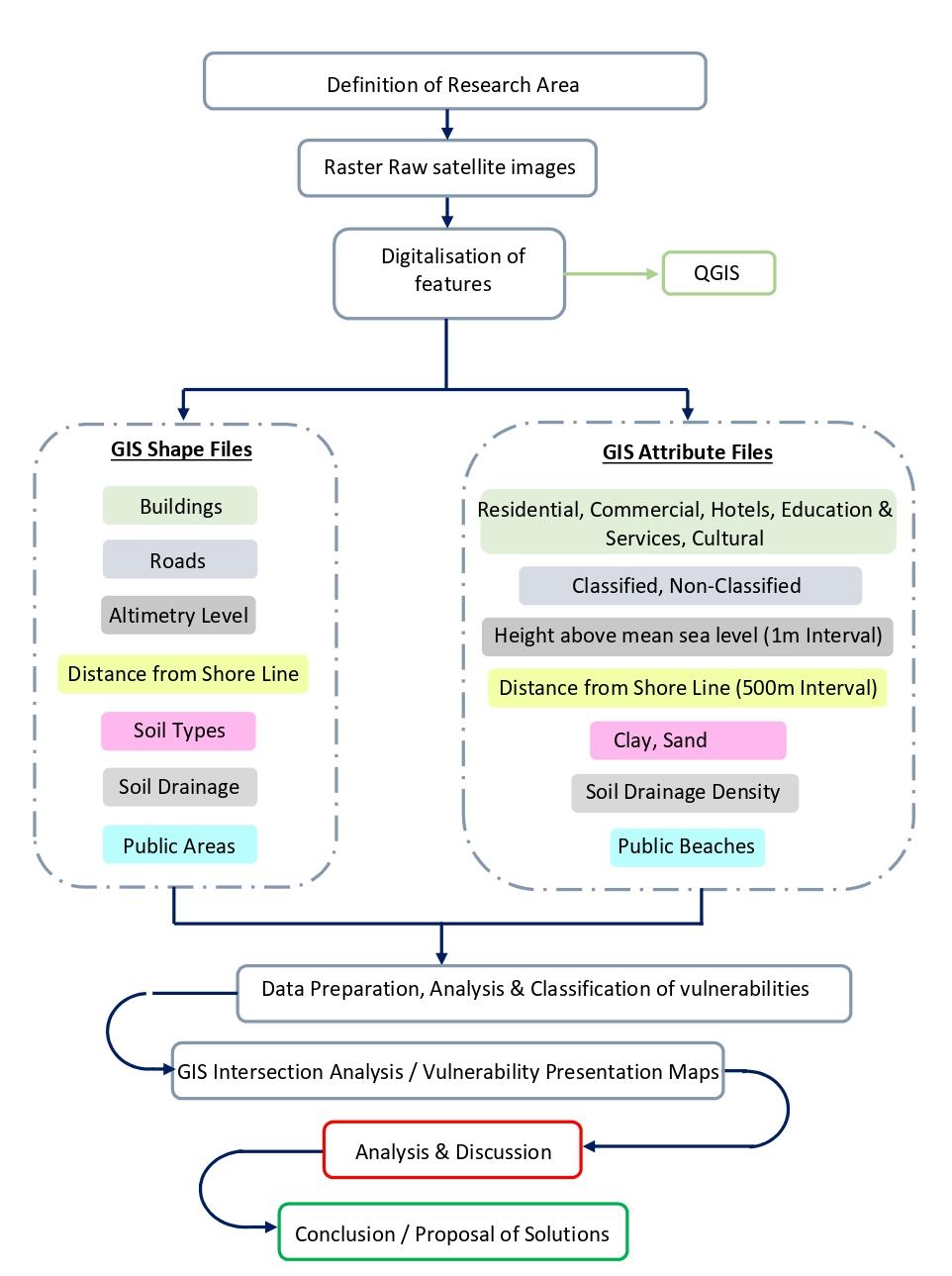 With a constant transformation within the physical features of the Grand Bay area, it is essential to have an up to date classified data regarding the Grand Bay infrastructure map. Several base maps were identified for raw satellite images including Sentinel Satellite and Bhuvan Geoplatform. Reliable satellite land use images of the Grand Bay region were ultimately obtained from the United States Geological Survey (USGS) web site. The spatial resolution of the images is less than 1m for the research area where building shapes and smaller features can be easily identified. The available images retrieved on January 2022 were also cross checked with actual ongoing major field projects in Grand Bay to confirm the authenticity of the updates. The following network diagram (Figure 3) illustrates the flow process of the methodology adopted for this research study.