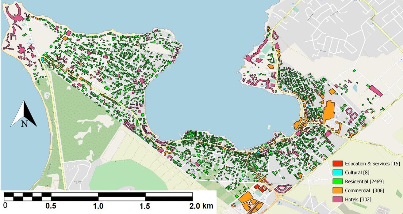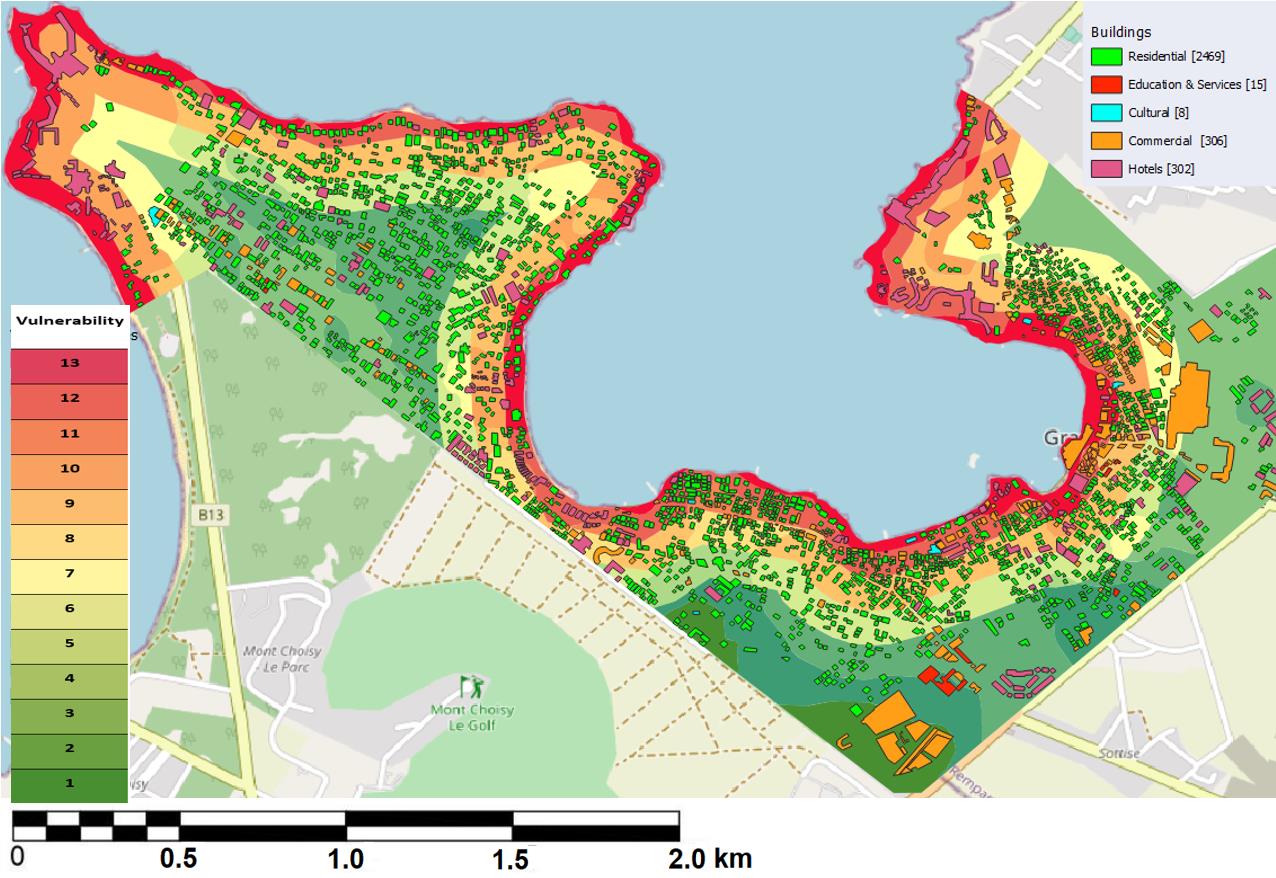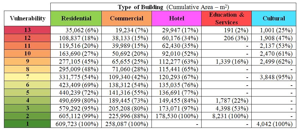 A high percentage of hotels (17%) lie within the highest vulnerability while 25% of the cultural buildings are also highly vulnerable to a minimum tsunami strike.