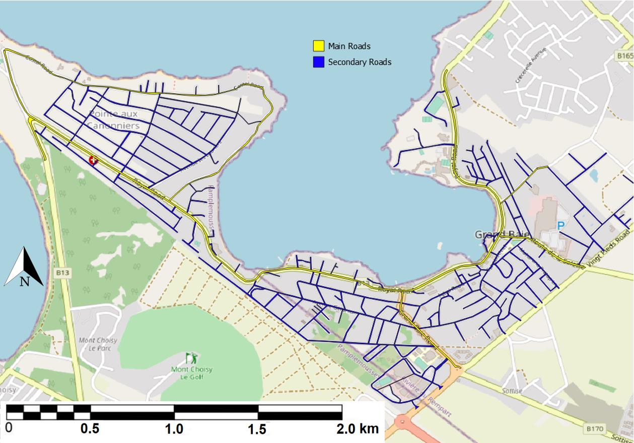The number of occupants per building has been obtained the Building and Land Use Permit Technical Guidelines and census carried out by statisticians from the Ministry of Economic Development, Financial Services and Corporate Affairs. As for the age of the buildings, they were obtained from the historical imagery feature on Google Earth. Images for the year 2003, 2016 and 2021 have been identified. Roads have been categorized into main and secondary access roads, represented in yellow and blue respectively as can be seen in Figure 5.