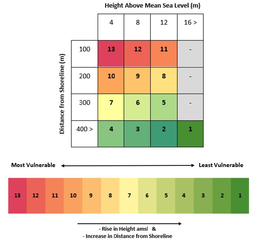 In this study, focus is made upon 3 vulnerability categories with respect to tsunami impacts. They are namely the building infrastructure vulnerability, the human life vulnerability and the environmenta vulnerability. A risk analysis matrix was created combining (i) the inundation zones with respect to height above mean sea level and (ii) the distance from shoreline (Table 3). Four aggregates (Low to Very High) are assigned to each of the parameter forming the risk matrix analysis numbered 1 to 13. Figure 7 illustrates the vulnerability chart.
