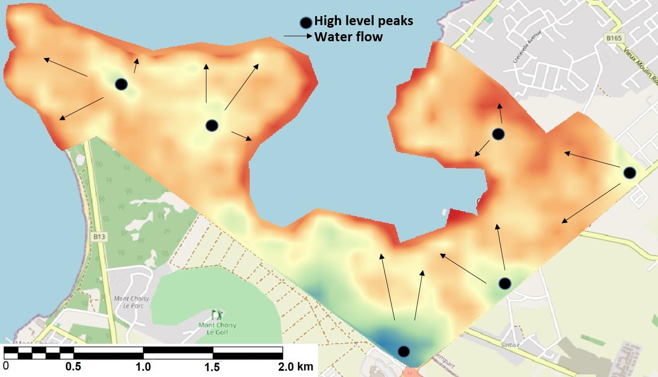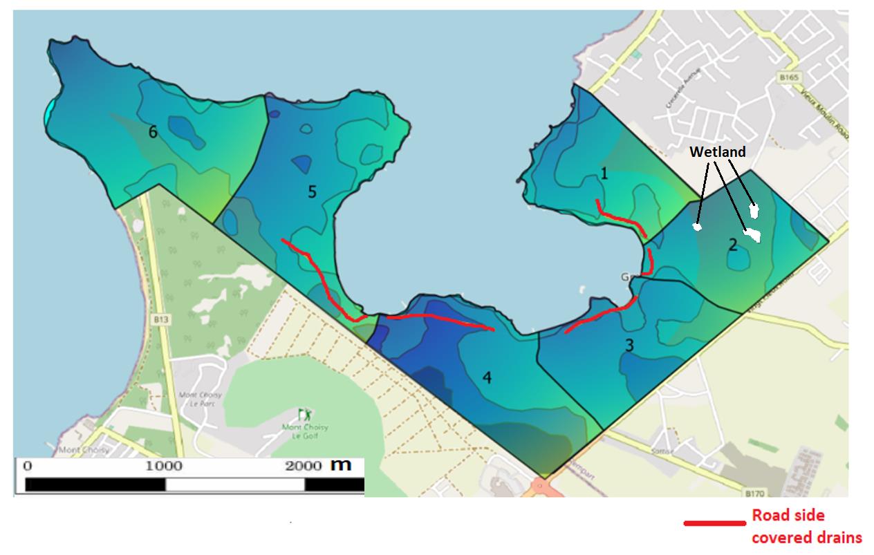 This type of soil will allow much saline water to infiltrate the ground water thus polluting the latter. A heat map derived from the contour lines from Figure 6 was processed from QGIS to illustrate the high level peaks as identified by 6 points in Figure 11. The arrows illustrate the natural water flow with respect to the topography of the terrain. Delimitation of the catchments was therefore carried out in QGIS setting 6 areas with boundaries halfway between the high level peaks (Figure 12). Due to the dense building constructions prevailing in Grand Bay, there is no actual river beds nor streams except the road networks that acts as existing water drains. The drainage density which is the total length of existing streams divided by the catchment area [21],is found to be around 0.8 km/km2 for each catchment. Values of the existing streams length have been taken as the length of the existing man made drains. The drainage density value, hence shows a lack of drainage system to evacuate surface run-off after a possible inundation by an abrupt sea water level rise. The drains are mostly located within the Regosols and the Silty Clay Loam which are of high permeability whereas the other regions are deprived of proper drains. The soil will eventually remain flooded for days without proper drainage inducing sea water intrusion [22] in the water table. A high surge of 4 m (Figure 6) will be sufficient to fill the three wet lands (Figure 12) with saline water causing much damage to the ecosystem that would require several years to be restored.