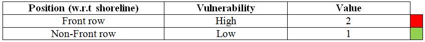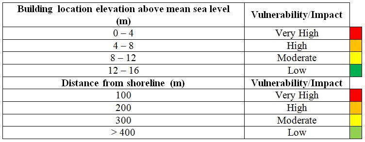 Building infrastructure vulnerability is an expression of the quantitative impacts to buildings or public infrastructure which are caused by a natural hazard. Building vulnerability depends on its location, design of the building and the type of materials used for its construction. The location is quantified as an attribute data to the QGIS software describing as 2 (sea front) and 1 (inland) as described in Table 4, whereas design and types of materials can be related to the age of the buildings. Table 5 illustrates attributes of the age factor of buildings. Both attributes (position and age) are combined arithmetically in QGIS to generate vulnerability maps for the buildings.