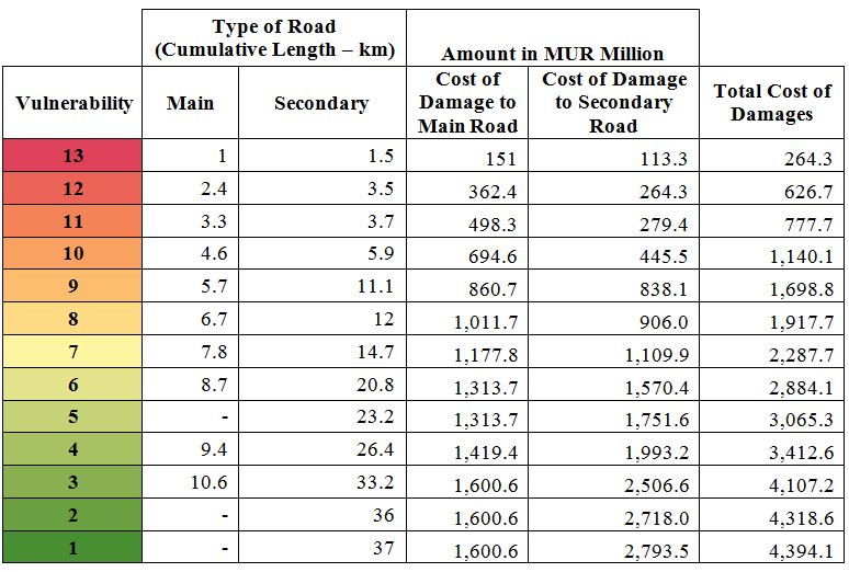 Table 8: Length of damage to roads and respective cost relative to vulnerability index