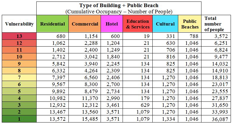 Table 10 illustrates the human life vulnerability with respect to the number of people occupying buildings and public beaches during the peak hour relative to the vulnerability Index. There is a computed total of 3572 people within the highest risk in the case of a tsunami surge.