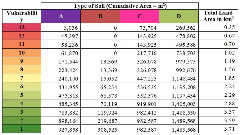 QGIS software analysis resulted in the mapping of vulnerability on a scale of 1 to 13 (Figure 8), 1 being the least vulnerable and 13 being the most vulnerable. Combined with the buildings attributes (Tables 4 and 5), Table 6 illustrates the cumulative area and the percentage of buildings affected with respect to each vulnerability scale.