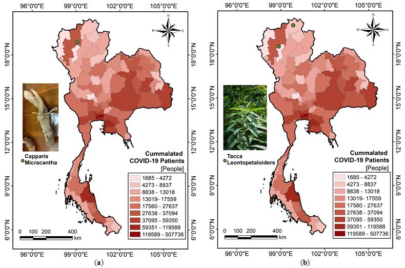 Figure 3: Herbs locations compared and the number of COVID-19 cases in Thailand (a) Capparis micracantha and (b) Tacca leontopetaloides)