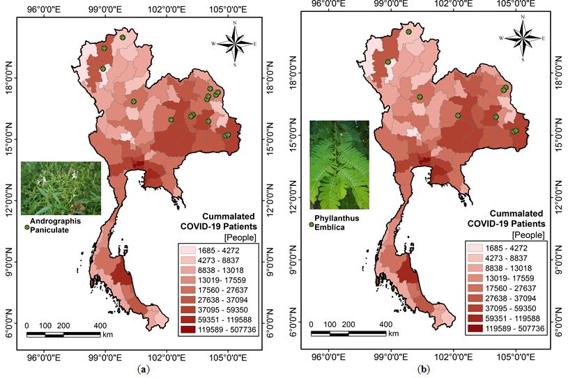 Figure 4: Herbs locations compared and the number of COVID-19 cases in Thailand (a) Andrographis paniculate and (b) Phyllanthus emblica