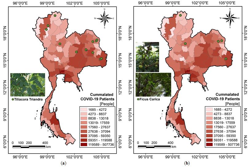 Figure 5: Herbs locations compared and the number of COVID-19 cases in Thailand (a) Tiliacora triandra and (b) Ficus carica