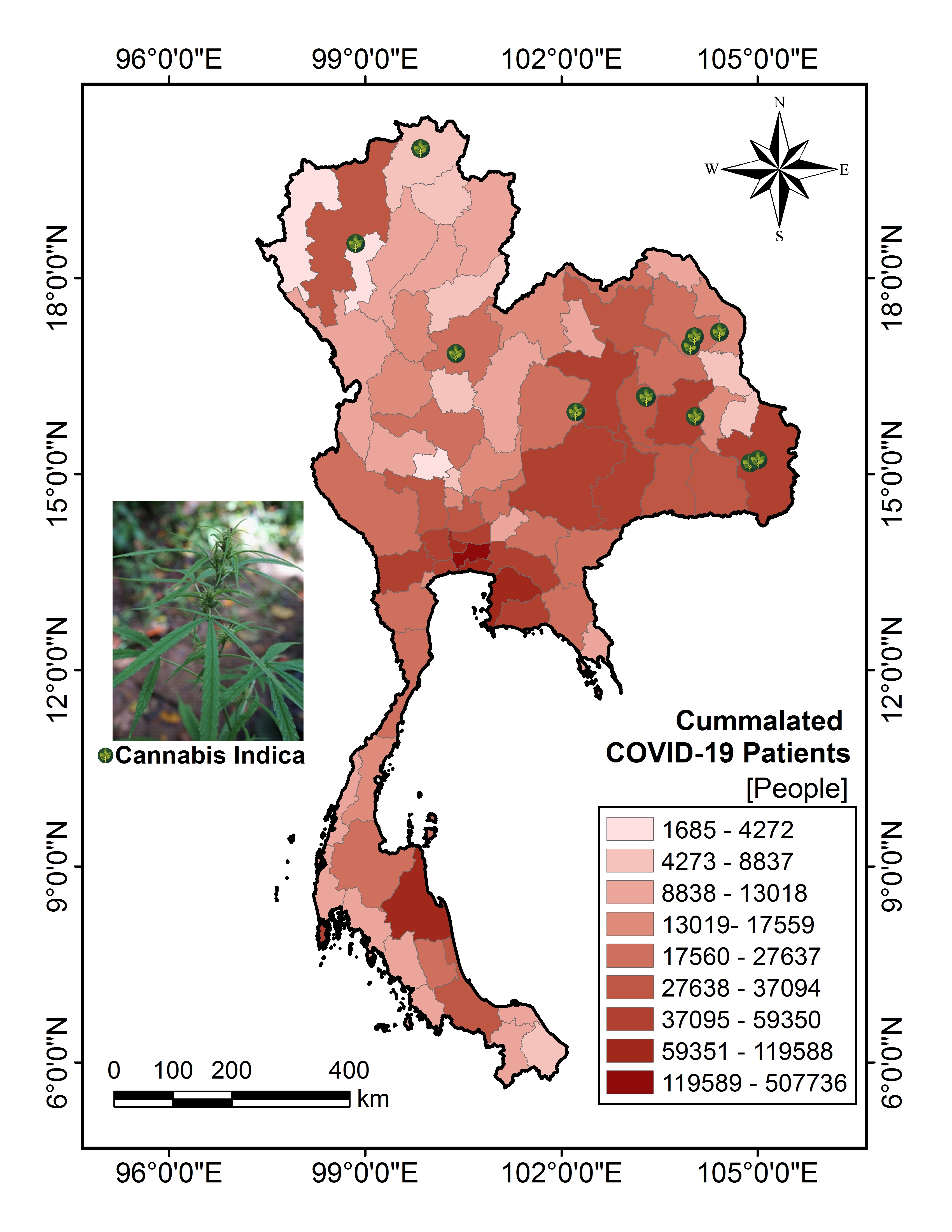 Figure 7: Herbs locations compared and the number of COVID-19 cases in Thailand Cannabis indica planting in Thailand compared to the number of COVID cases