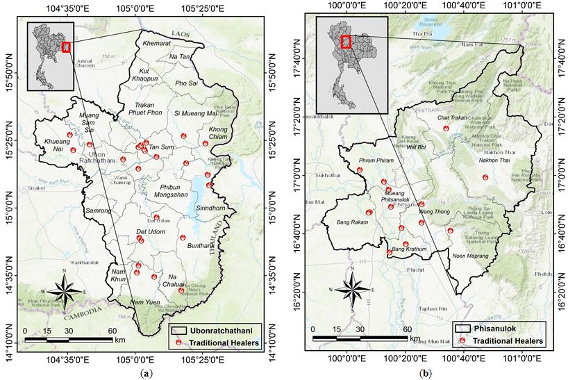 Figure 10: Locations of traditional healers (a) Ubon Ratchathani (b) Phitsanulok