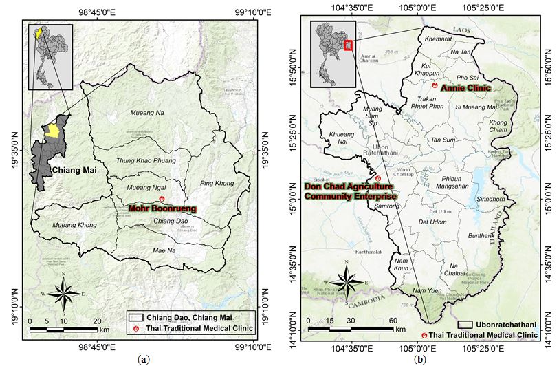 Figure 11: Survey map of herbs (a) Folk healers in Chiang Dao district, Chiang Mai province and (b) Traditional healers in Ubon Ratchathani province