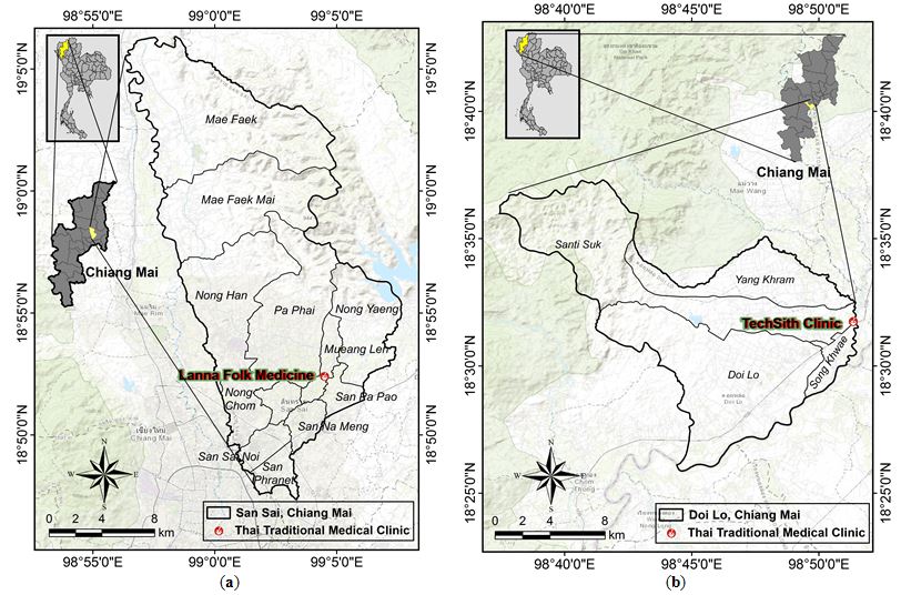 Figure 12: Survey map of herbs (a) Traditional Healers in San Sai district (b) Doi Lo district, Chiang Mai province