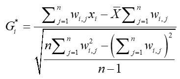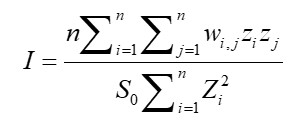 Where xiis the attribute value for feature j, wi,j is the spatial weight between feature i and j, n is equal to the total number of features. and S are defined in equations 8 and 9: