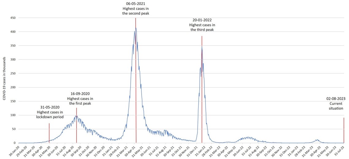 Figure 2: Daily total number of confirmed cases of COVID-19 in India from January 30, 2020 to July 31, 2023