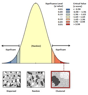This deviation is substantial enough to rule out the possibility of a random chance. In the case of positive z-scores, higher values indicate more intense clusters, referred to as hot spots. On the contrary, negative z-scores with smaller values represent a cold spot i.e. clustering of low values [42].