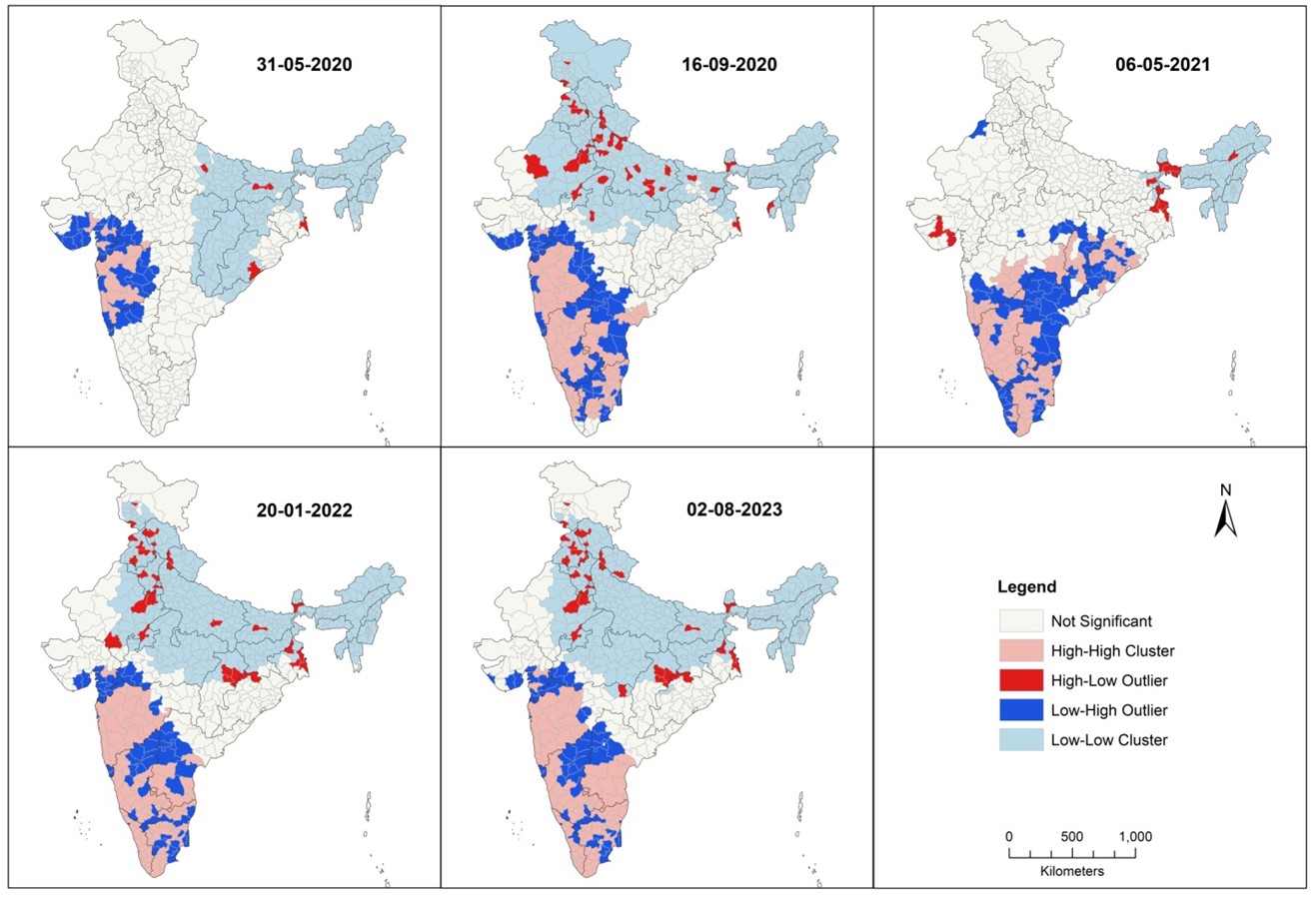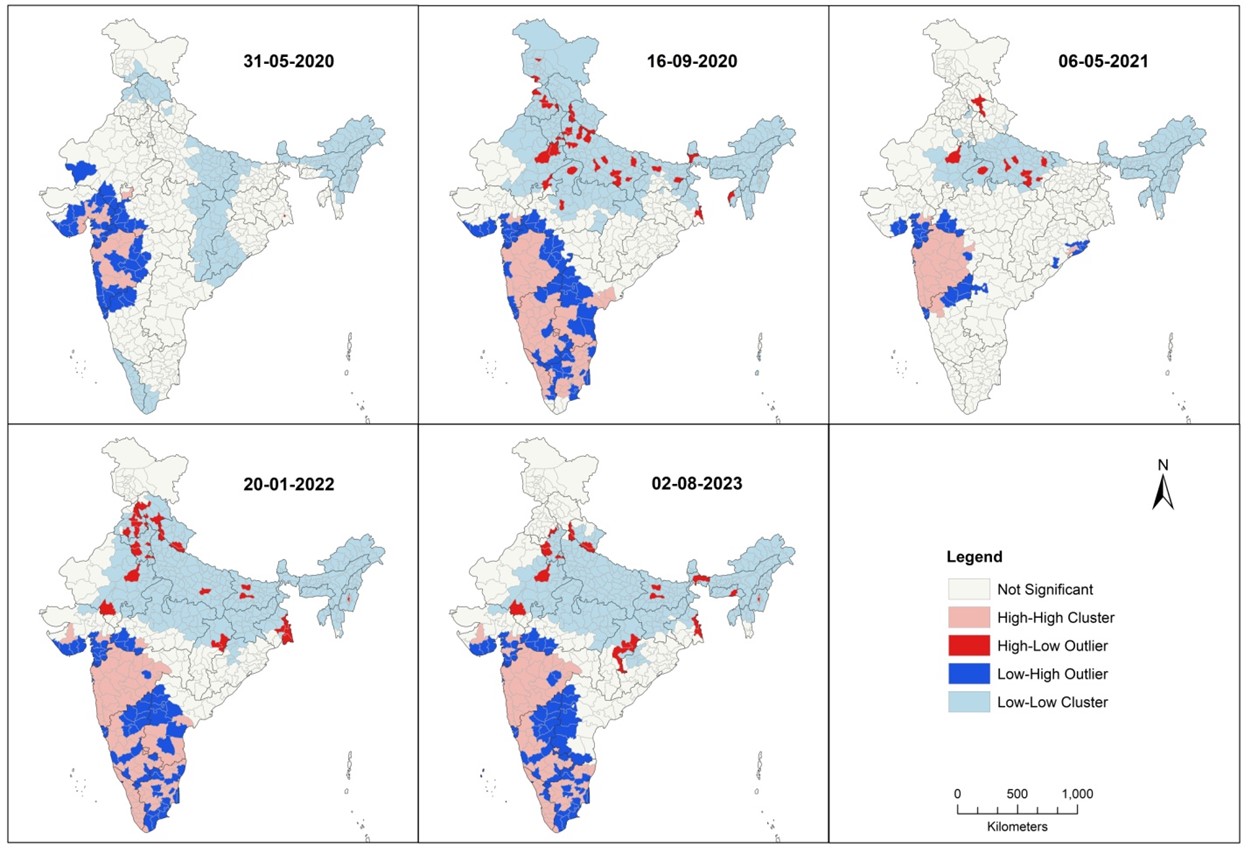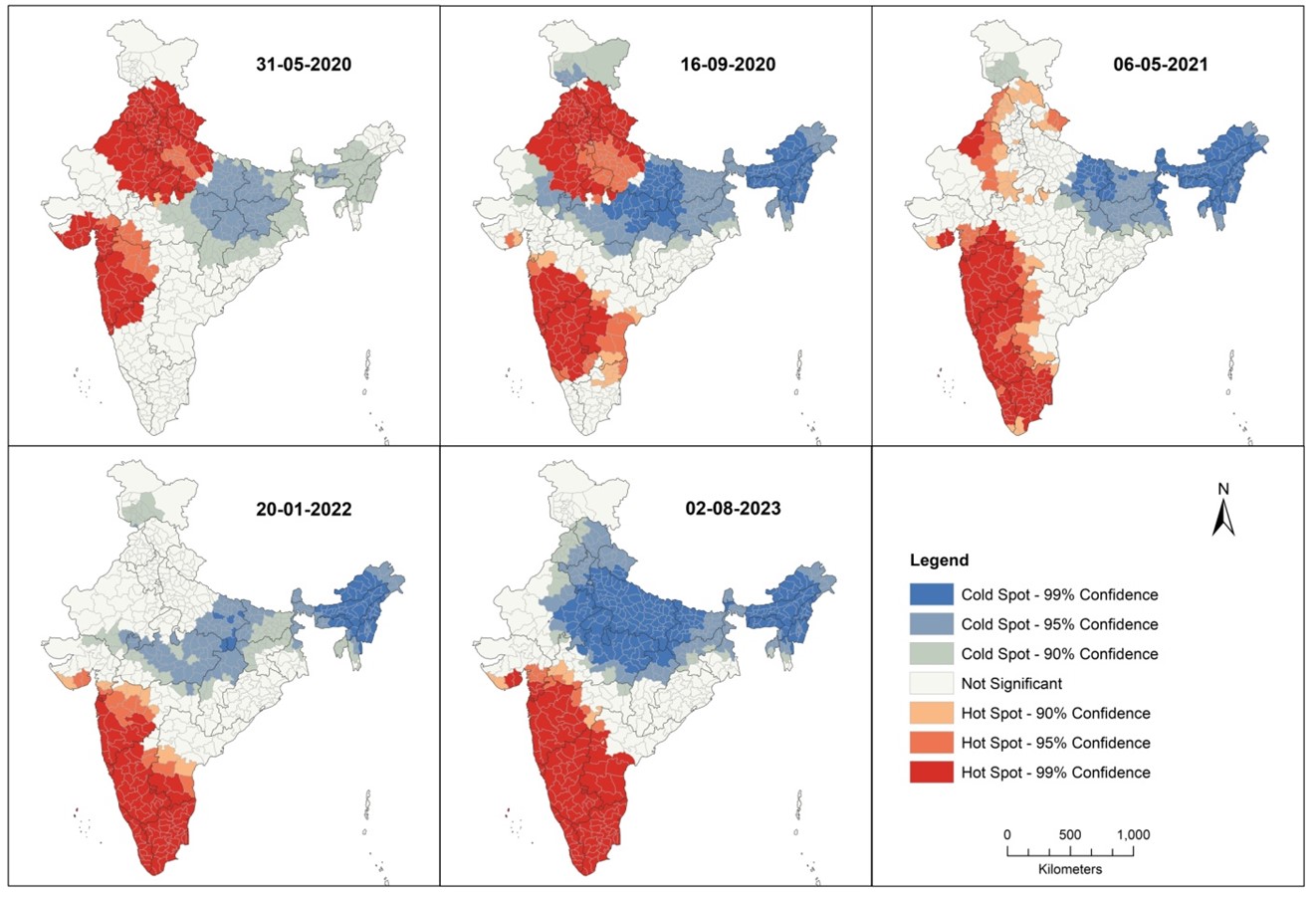 During this period, a high-value cluster of cold spots (99% confidence) was detected in the country's north and northeast regions. As in the previous time period, high-value hot spot clusters were identified in the south and south-west regions in May 05, 2021, but certain districts showed low-value clusters with a 90% confidence level. By January 20, 2022 the cold spot cluster had disappeared from the northern states and high-value cold spots remained only in north-eastern region. High-value hotspots were again limited to the states of Maharashtra, Karnataka, Kerela and Tamil Nadu. On August 02, 2023, a high-value cluster with a 99% level of confidence had expanded to other districts of the southern and south-western states. High-value cold spots had established themselves in Uttar Pradesh, Madhya Pradesh and north-eastern states. They were surrounded by a moderate-value cold spot district.