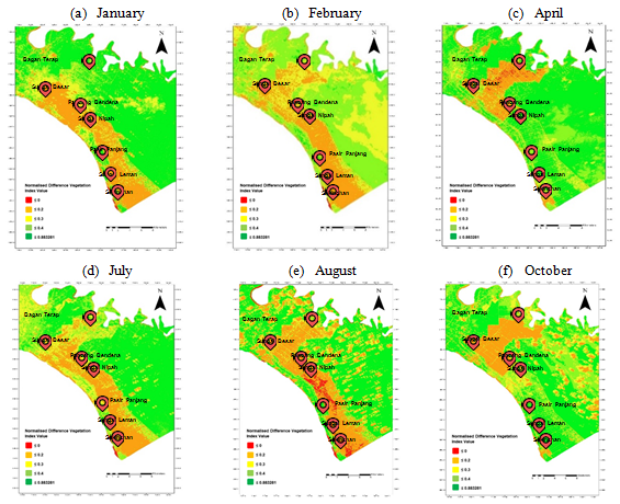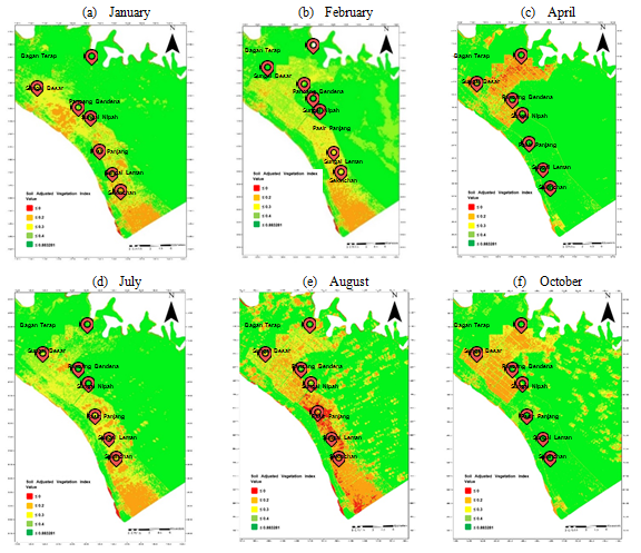 From the Figure 2(f), some area shows a yellow coding, ?0.20 in Sungai Nipah which indicates that area was partially covered with bare soil. However, in Figure 3(f), the same area shows that area was entirely covered with vegetation. The difference in colour in both maps for the same place indicates that SAVI has done better than NDVI. This is because SAVI can read the values better than NDVI as NDVI only focus on the vegetation index. Most of crop monitoring studies can confuse between soil or unhealthy vegetation that have similar colour as soil. So by applying the L soil correction in Equation 2, this soil noise can be reduce so that it can show better and clear map presentation.
