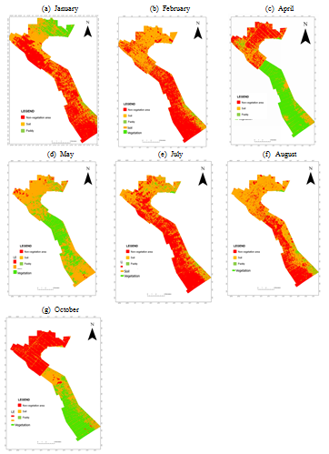 Figures2 and 3 show the crop health map for each month estimated from NDVI and SAVI, respectively.
