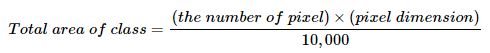 In this research, the dimension of pixel used was 30 metres*30metres, which made the 900 square metres of area. It needs to be divided by 10000 to convert from the square metres to hectares.
