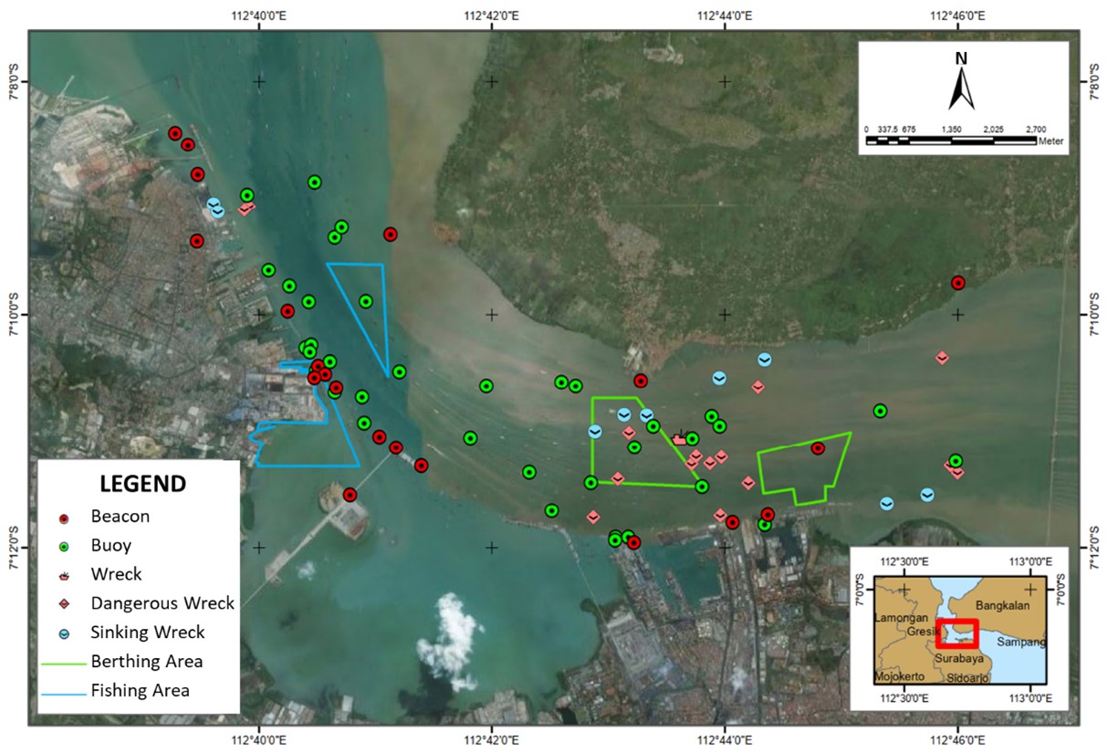 Generally, it is described as a location in a town or city with a harbor or access to navigable water where ships load or unload [5]. In practice, these various facilities are displayed on a digital nautical map that, in real-time, shows the direction and location through the ship's monitor, Electronic Chart Display Information System (ECDIS). Following IHO Publication S-57 [6], this device displays two-dimensional water areas, so it still requires intuition for seafarers to understand the location of the ship's presence and ensure obstacles in shipping safety. The location of this research, the Madura Strait, is a semi-enclosed sea that separates the island of Java from the island of Madura [7].