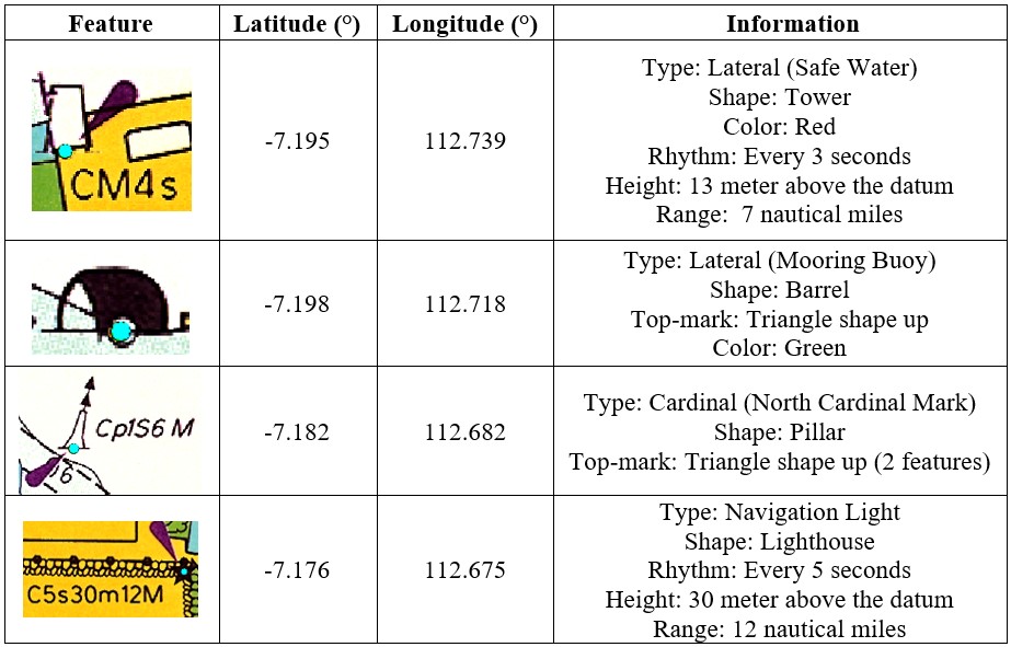 The initial step utilized as a base of the next step is the digitized features. Information on each feature on the marine map is shown in Table 3 and Table 4. The feature numbers result from the digitization process of the National Nautical Chart number 84 of 2016, particularly in the research area. All features are located in the Surabaya West Shipping Channel and are spread around ports along the channel, such as Lamong Bay Terminal.