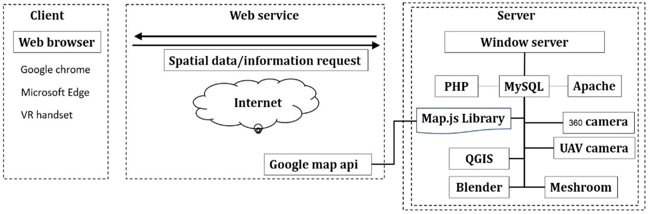 The structure of the article begin with the design and development of a framework with an open-source code suite that incorporates the WebGIS platform for developing a database function [13] and [14], an online cultural mapping service system, and an information display virtual tour of environments, using free software to create 3D models that are processed using the photogrammetry method [15]. The second part of the article presents the system architecture that supports the technology. GIS-VR-3Dmodel-internet consisting of a combination of hardware, software, and connection protocols for collective functioning, which define a framework on how the system and the internal model operate alongside with the data preparation in accordance with spatial data [16] and [17]. The next part presents the results of the system user satisfaction assessment. Finally, this paper concludes with conclusion, suggestion and ideas for future research direction.