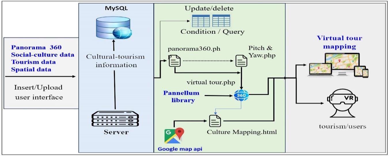 As of Now, the development of the Web GIS framework includes open-source code and libraries for storing and managing databases, mapping scripts for online maps, the Pannellum library, and an A-Frame library for visualization, rendering, and improving images in virtual tours that show results with computer-generated imagery. It also covers photogrammetry applications for free 3D modeling software to prepare digital documents for serving and disseminating cultural tourism information on three platforms, namely: online culture maps, virtual tours, and 3D models, which can operate together as a standardized Web map service. For practitioners new to WebGIS, this framework can simply help develop understanding and implementation. The end-user can be easily accessed via online maps or with a list navigation toolbar. It is elaborated in detail in the following system components: