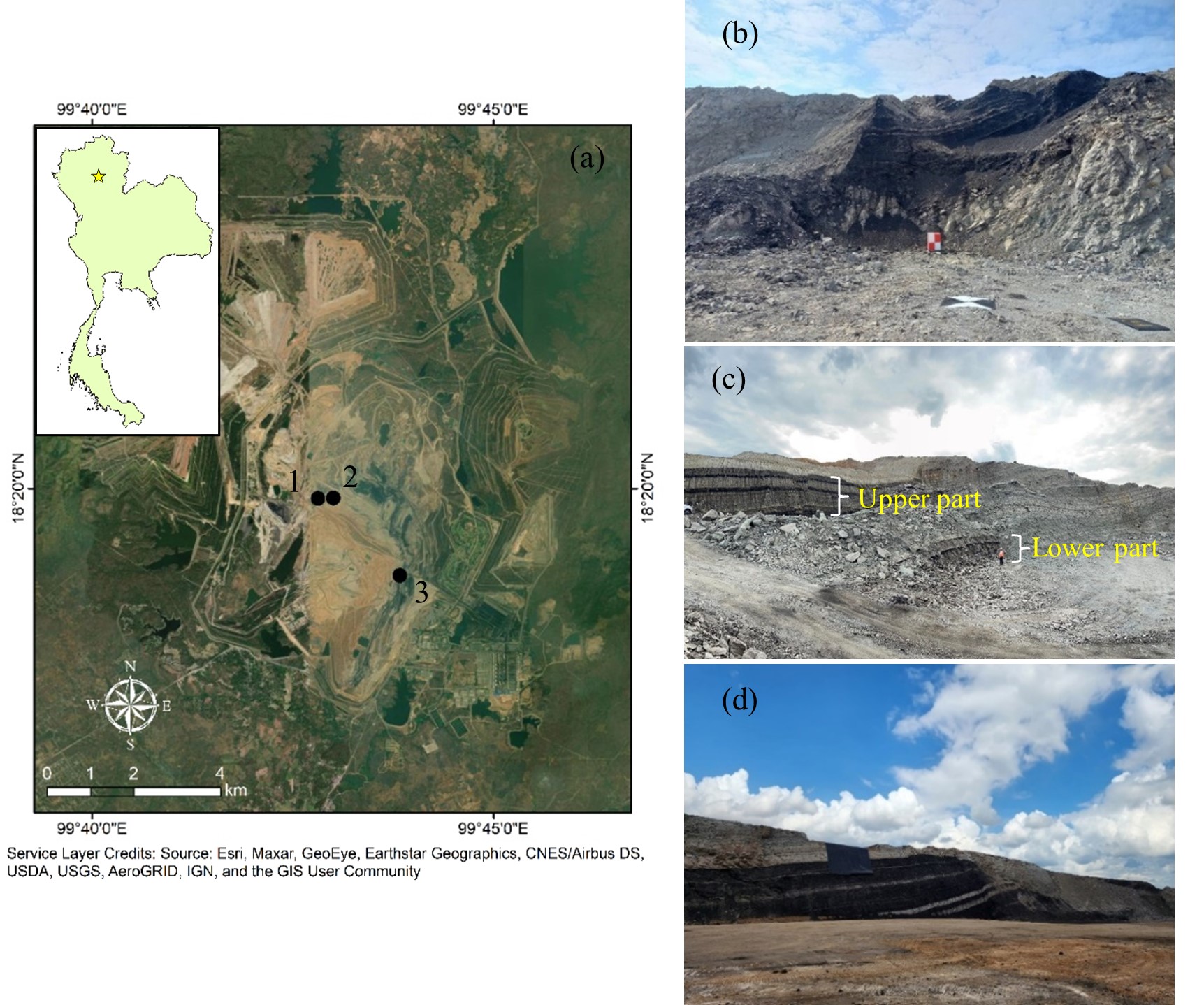 Figure 1: (a) Topographic settings of Mae Moh coal mine, Mae Moh district, Lampang, Thailand. The inset illustrates the location of the Mae Moh coal mine (yellow star) in northern Thailand. Numbers depict the study sites of the outcrop surveys (b) The first site (c) The second site (d) The third site