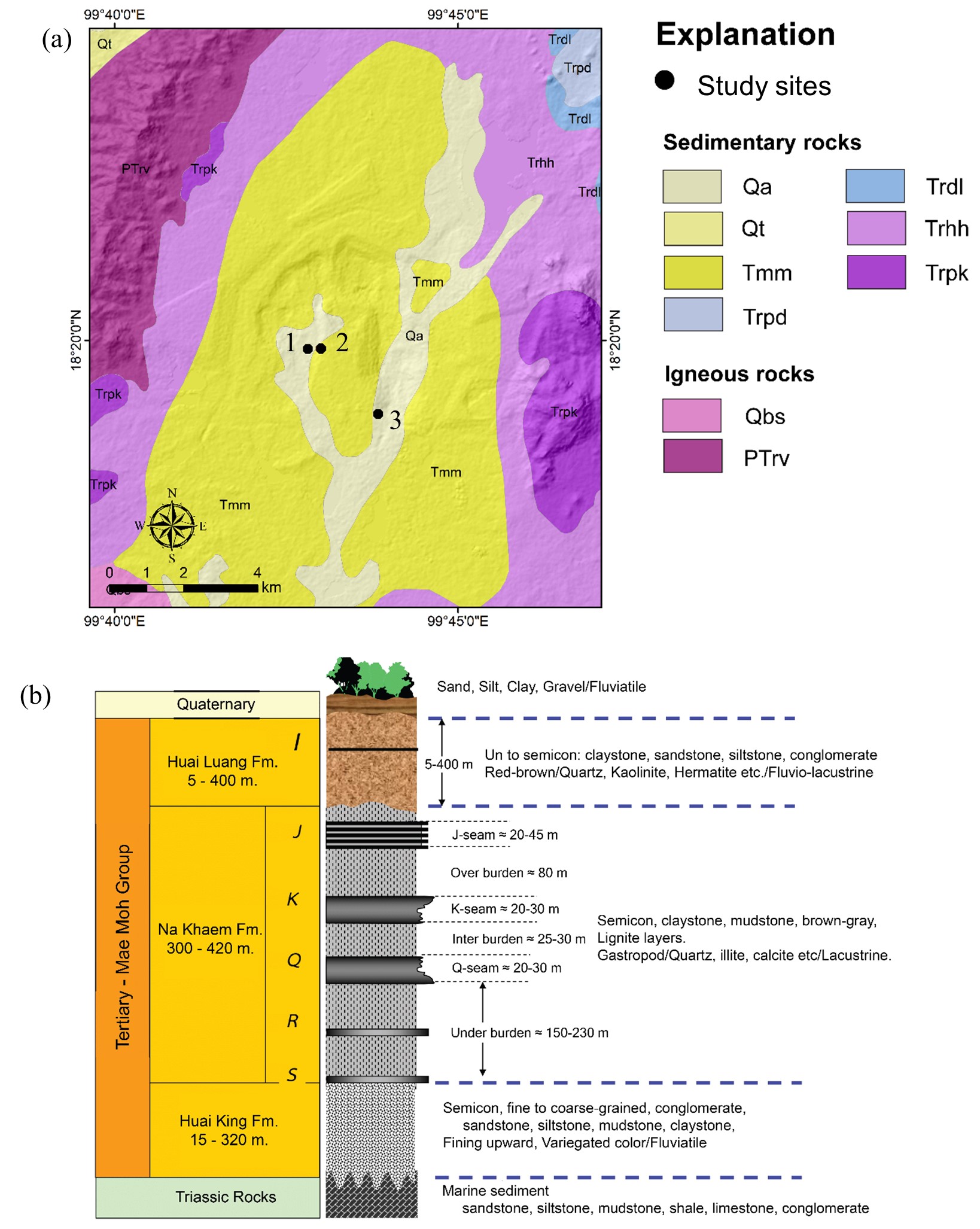 Figure 2: (a) Geological setting of Mae Moh coal mine (modified from [16]). Abbreviation of geological formation; Qa: Quaternary alluvial sediment, Qt: Quaternary alluvial terraces, Tmm: Tertiary Mae Moh semi-consolidated and unconsolidated sediments with a coal-bearing formation of five zones of lignite, Trpd: Triassic Pha Daeng formation, Trdl: Triassic Doi Long formation, Trhh: Triassic Hong Hoi formation, Trpk: Triassic Pha Kan formation, Qbs: Quaternary basalt, and PTrv: Permo-Triassic volcanic rock. Numbers depict the study sites of the outcrop surveys. (b) Stratigraphic column of Mae Moh basin (modified from [17] and [18]).