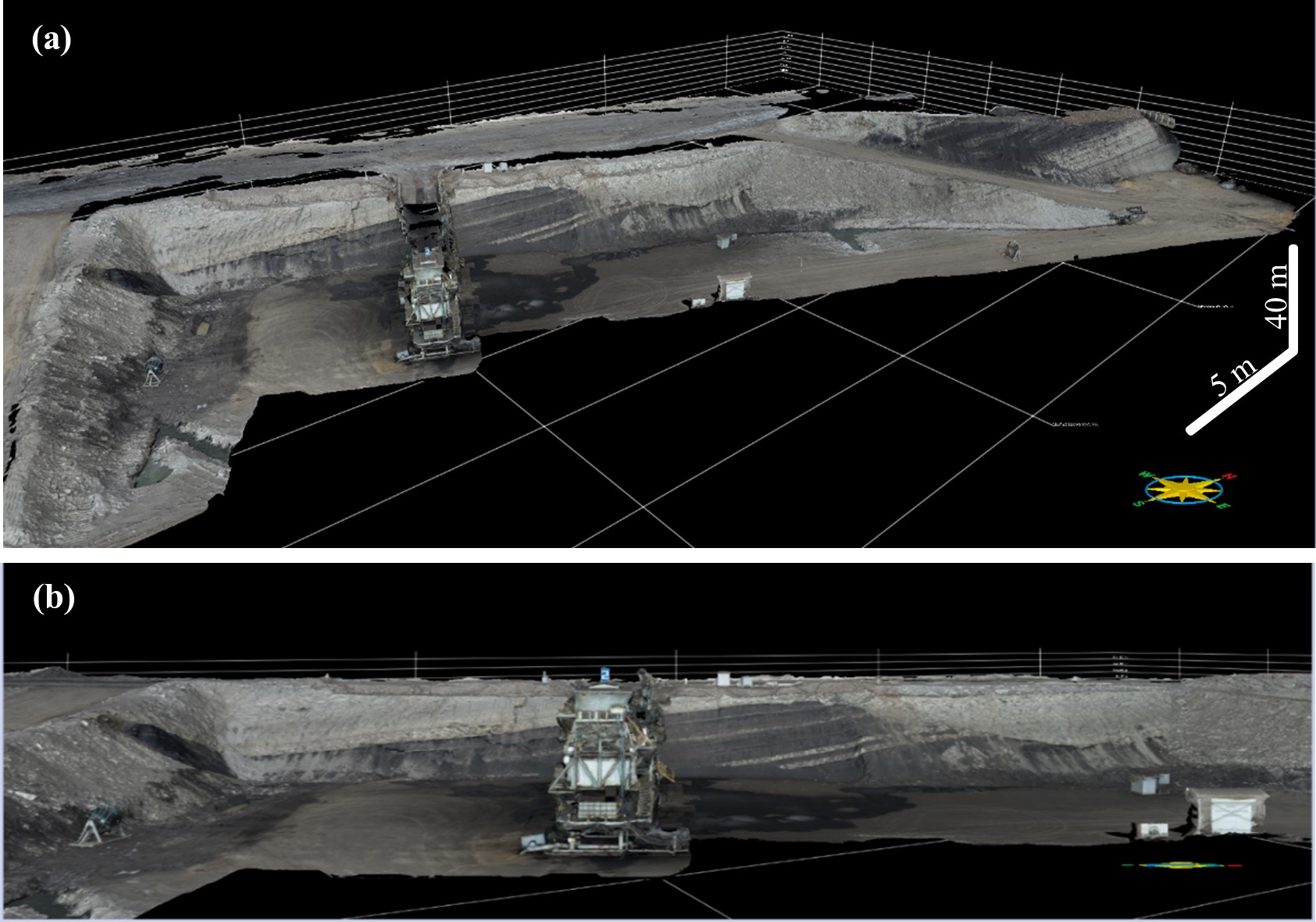 A representative view of the 3D DOMs represents the top and 3D views of the three surveyed outcrops in the Mae Moh coal mine (Figures 5 to 7). The first model covers approximately 625 m2, representing the exposed coal seam layer in the middle of the model (47Q 575400E 2026992N). The rest of the model shows the layered sediment covering the coal seam (Figure 5). This second model covers 2,000 m2, including the total lower and upper parts of the outcrop in the southeast and the thick sediment cover in the south-southwest side of the model. The lower part is approximately 15 m high, measured from the base to the excavated overburden. The upper part is about 25 m high. This upper part exposes some coal seam layers with a small fault line (47Q 575734E 2027002N) (Figure 6). The third model includes approximately 2,250 m2, representing the thick coal seam layer of the 25-m-heigh outcrop and the semi-mobile sizing station in the middle of the model (47Q 577203E 2025254N). The northwestern side of the model is covered with overburdened sediment (Figure 7). For structure modeling and analysis, the variations of coal seam thickness and structures can be observed from these models, allowing us to measure the outcrop's bedding planes and fault planes.